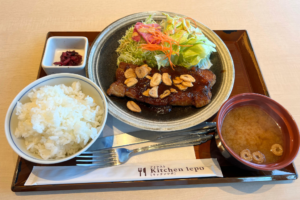 フライドガーリックのアクセントも食欲を掻き立てます。お肉だけでなく付け合わせのサラダもボリュームがあり、お味噌汁やお漬物があって大満足の定食となりました。