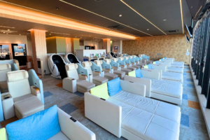 ゴロンとできる畳敷きのスペース、広々としたカップルシート、リクライニング可能な一人用シートが設置されています。有料ですがマッサージチェアもありましたよ。