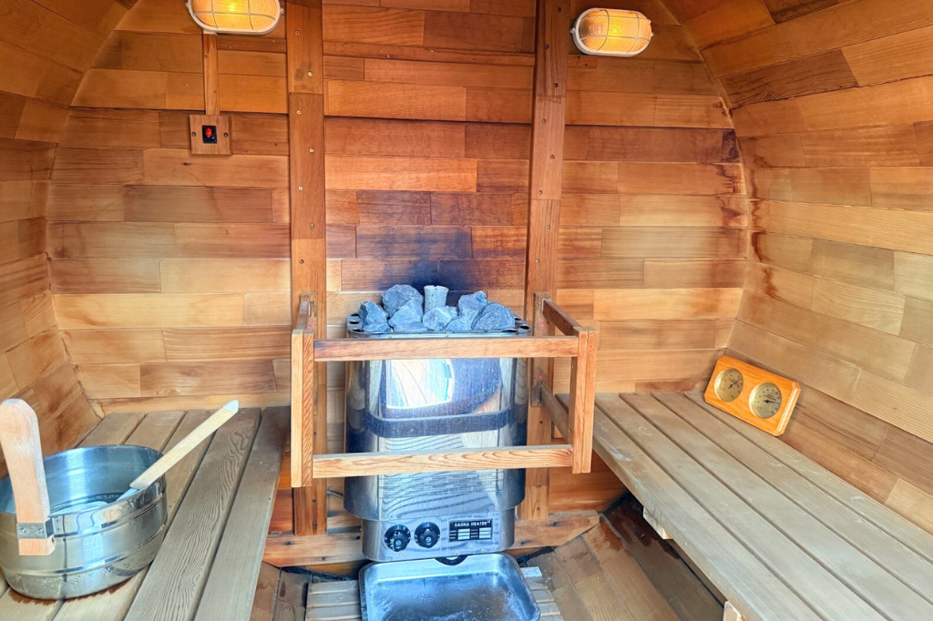 中に入ってみると、木の造りと香りが自然に溶け込むような安心感を与えてくれます。この包まれるような感覚は、バレルサウナでこそ味わえますね。
