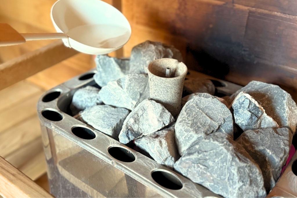 中央にあるサウナストーブには、サウナストーンが置かれており、セルフロウリュを楽しむことが出来ます。