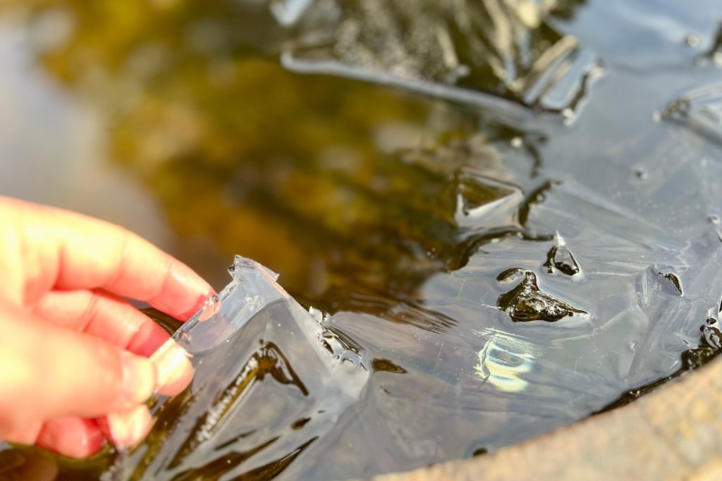 サウナから出たら目の前にあるワイン樽の水風呂へ一目散に向かいます。が、なんと水面が凍っています。普段の水温は18℃前後だそうですが、冬場はシングル(一桁台の水温)まで下がるそうです。